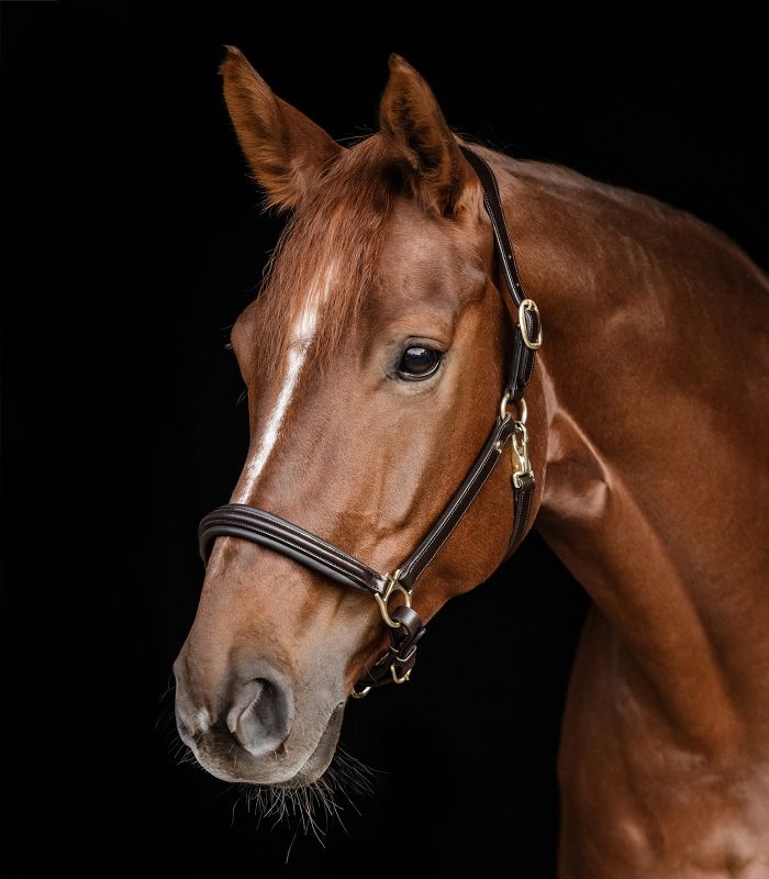 Elegant leather halter with softly padded noseband and headpiece. Headpiece adjustable on both sides and easily adjustable chin strap.