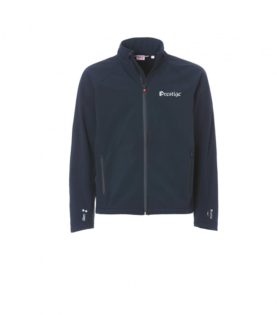 Softshell with Prestige Italia logo, long sleeves, dark blue with white logo. Material: 100% polyester with a water resistance of 3000 mm.
