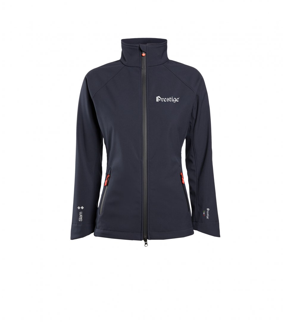 Softshell with Prestige Italia logo, long sleeves, dark blue with white logo. Material: 100% polyester with a water resistance of 3000 mm.