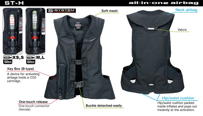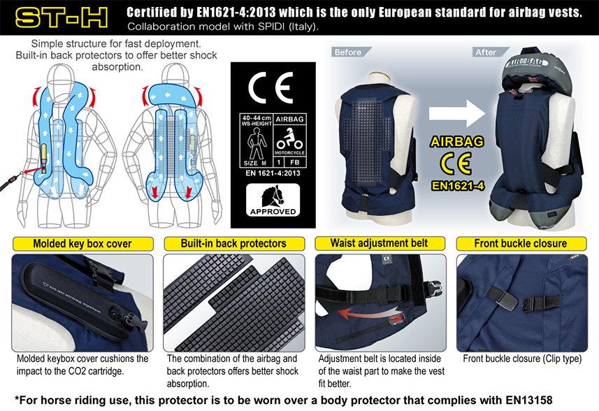 Acest model vine ca o imbunatatire a celui mai apreciat model H, pe care il vedem in continuare, atat in competitii cat si in centrele de echitatie, chiar si dupa aproape 10 ani de folosinta. Noul design aduce o protectie sporita a soldurilor in momentul declansarii. Este un model Slim, ce nu restrictioneaza libertatea de miscare si poate fi purtat peste echipamentul competitional. Modelul ST – H este potrivit pentru a fi utilizat în toate disciplinele, de la dresaj, sarituri, stil western, pana la plimbarile de recreere.