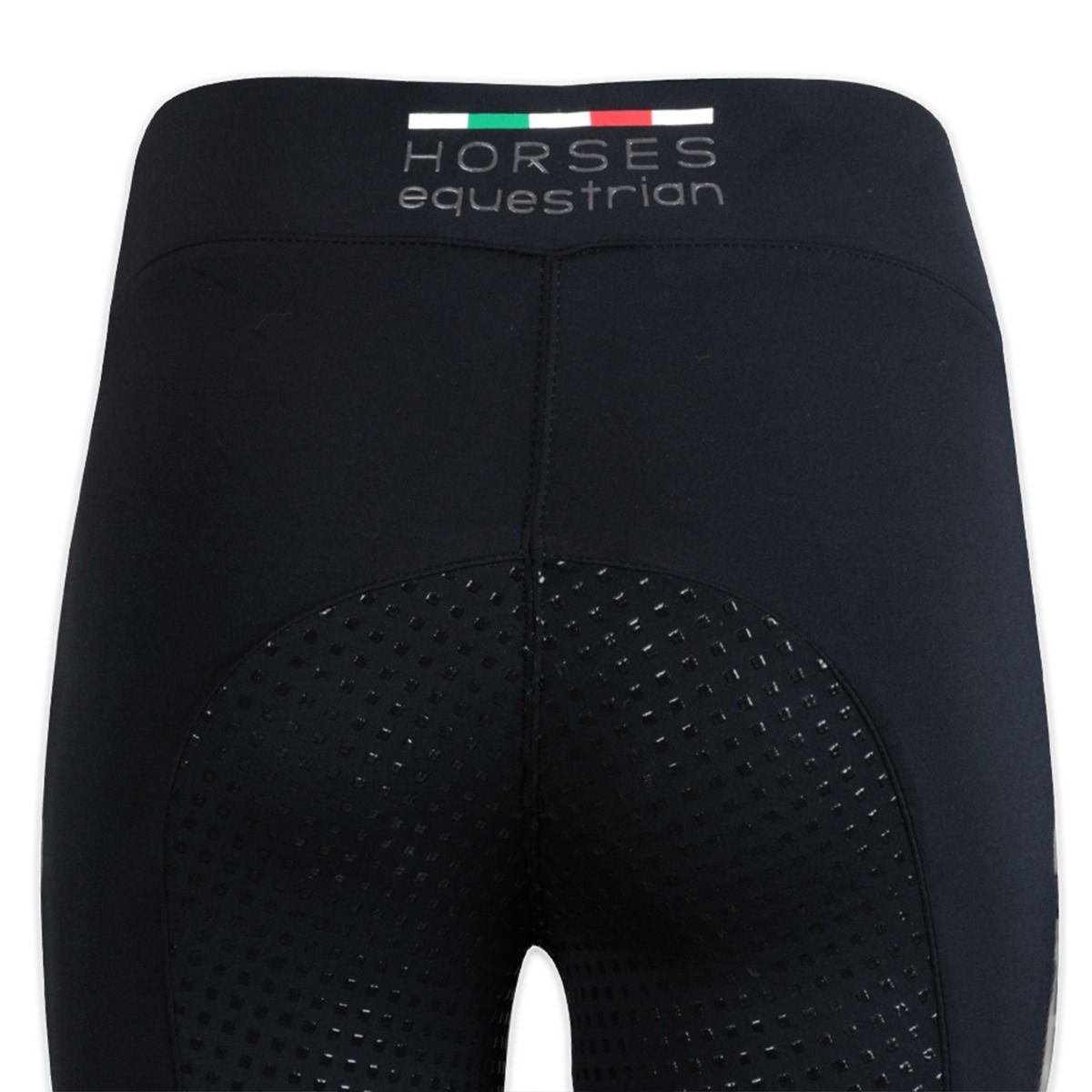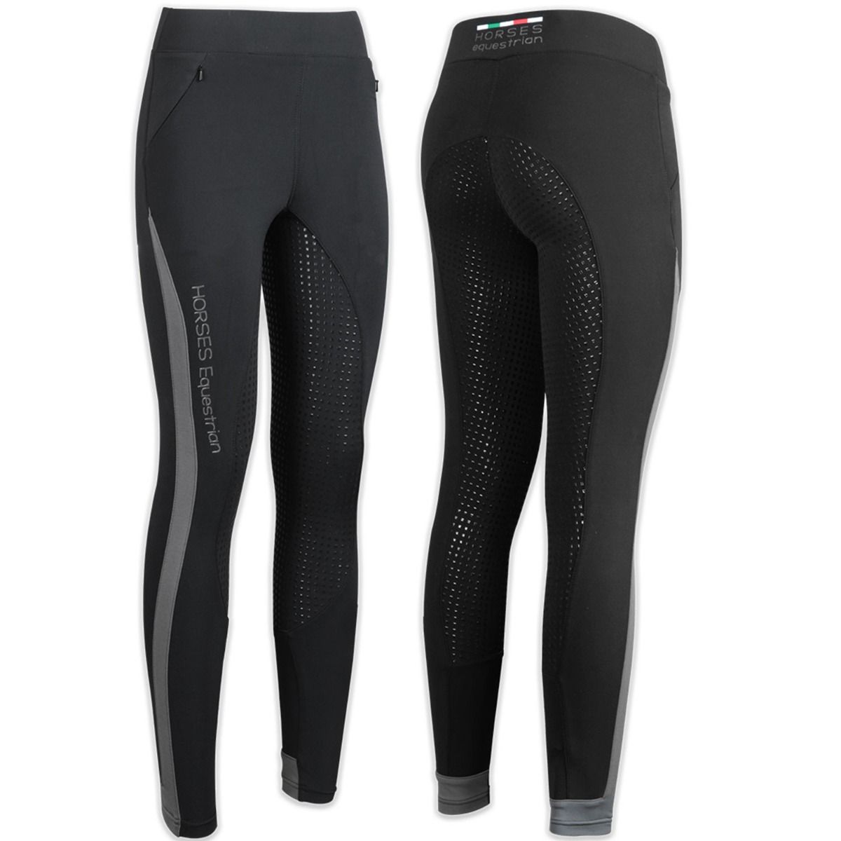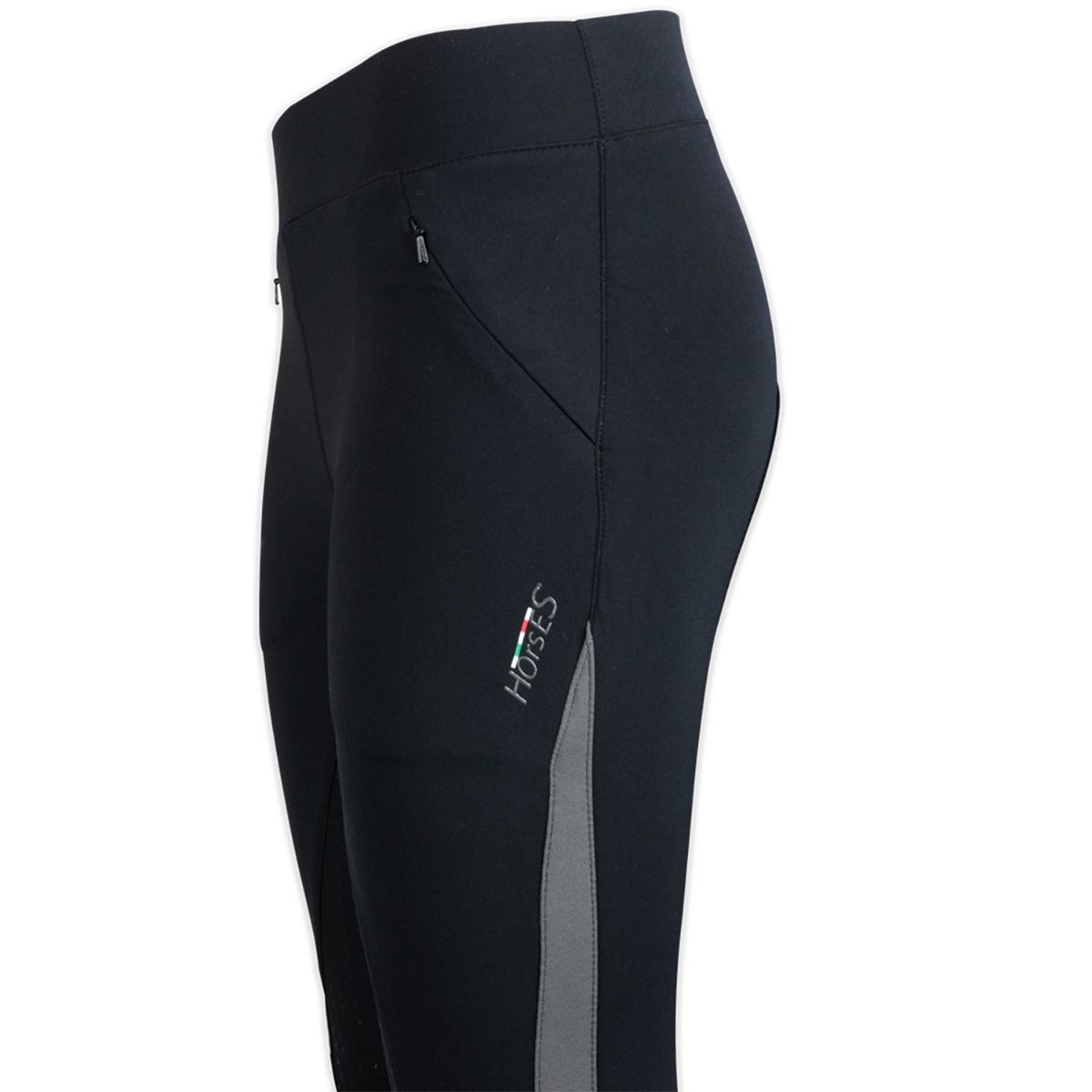 Au Full Grip din silicon, pentru a maximiza stabilitatea pe șa, buzunar frontal cu fermoar dublu, plasture cu logo Horses pe partea stângă și inserții din material elastic gri.