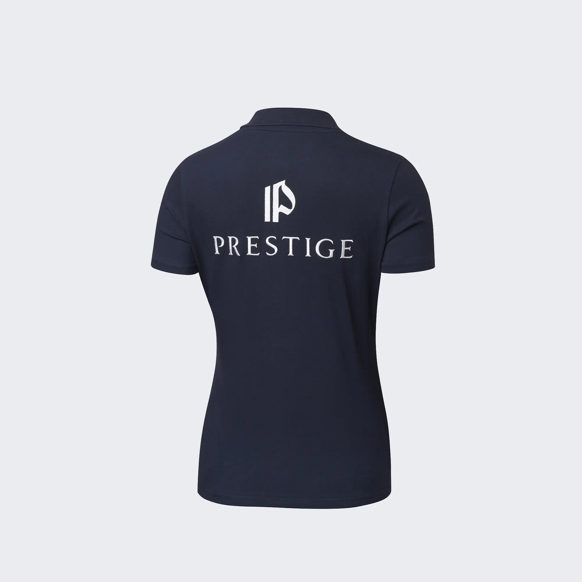Polo cu logo Prestige, maneci scurte, culori albastru sau alb. Logo brodat argintiu. Material: 95% bumbac si 5% elastan.