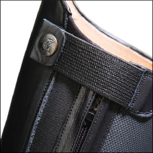 Partea din spate cu banda elastica ranforsata pentru a adera mai bine la gambe, cu un suport de pinteni aplicat pe cureaua care protejeaza fermoarul.